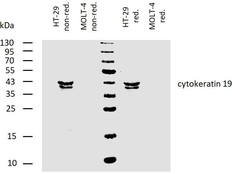 Keratin 19,Cytokeratins are a subfamily of intermediate filaments and characterized by remarkable biochemical diversity. They are represented in epithelial tissues by at least 20 different polypeptides, molecular weight between 40 kDa and 68 kDa. The individual cytokeratin polypeptides are designated 1 to 20 and divided into the type I (acidic cytokeratins 9-20) and type II (basic to neutral cytokeratins 1-8) families.,K19, CK19, CYK19, KRT19, K1CS
