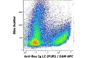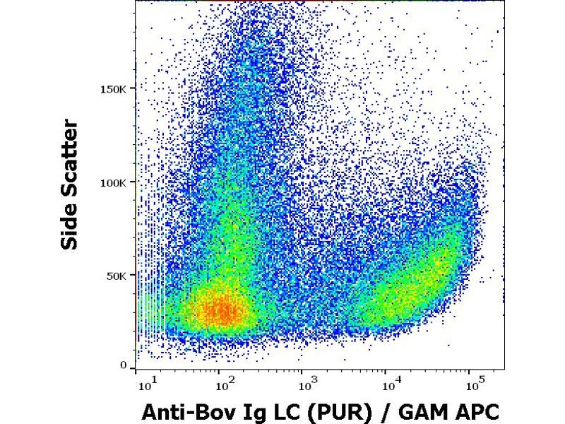 Western blotting: Recommended dilution: 0,5-1 μg/mL, overnight at 4 °C. Sample preparation: bovine serum, dilution 1:50 in Laemmli reducing buffer, boiled in water bath for 3 min. Reducing conditions, 12 % separating gel. The antibody strongly reacts with bovine IgG light chains, weakly reacts with IgM.