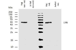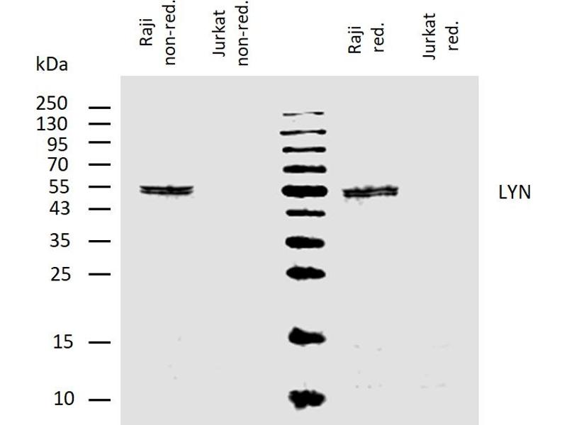 LYN proto-oncogene, Src family tyrosine kinase,Lyn is a Src-family protein tyrosine kinase that is predominantly expressed in hematopoietic cells. It is associated with a number of cell surface receptors including the B cell antigen receptor (BCR) and Fc receptors. Upon their triggering, Lyn phosphorylates subunits of these receptors in a cholesterol-dependent manner, utilizing the plasma membrane lipid raft system. The phosphorylated intracellular domains of the receptors are accessible for cytoplasmic Syk tyrosine kinase, which is activated by Lyn-mediated phosphorylation and which transduces the signal to downstream adaptors. Lyn is abnormally distributed in acute myeloid leukemia cells and seems to be a novel pharmacologic target of this disease.,JTK8, p56Lyn, p53Lyn