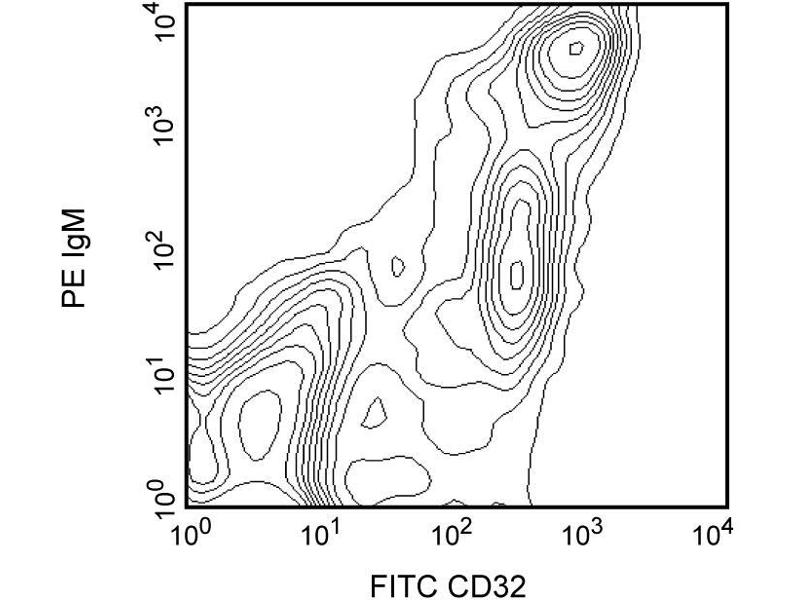 The D34-485 antibody reacts specifically with CD32, the FcgammaII receptor. Rat CD32 is expressed on B lymphocytes, myeloid cells, and some lymphocytes in the thymic medulla. D34-485 mAb blocks binding of aggregated immunoglobulins to the FcgammaIi receptors in vitro. This antibody is routinely tested by flow cytometric analysis.