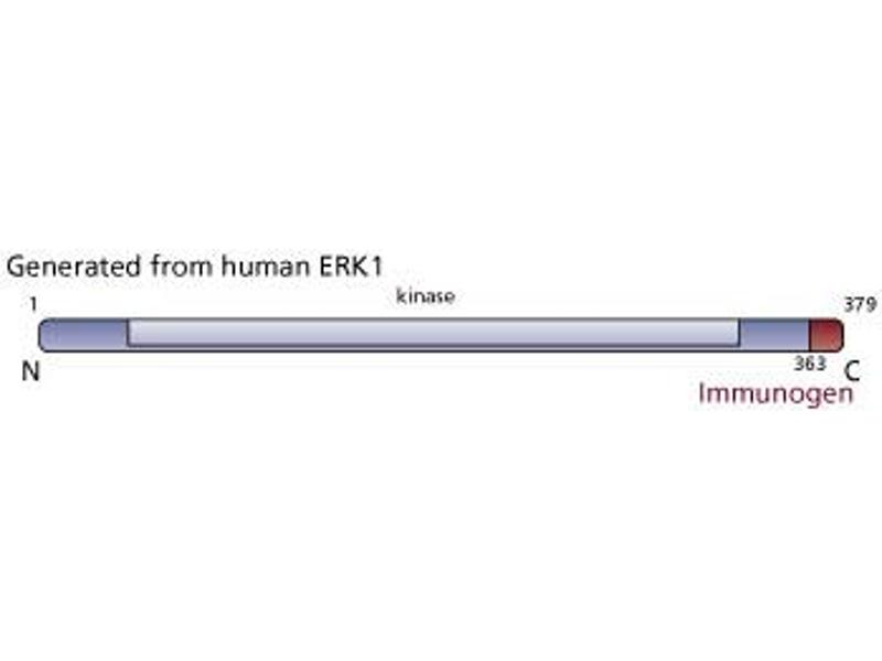 - A serine/threonine specific protein kinase, called MAP kinase or more recently ERK1 (extracellular signal regulated kinase) is activated in cells following stimulation with EGF (epidermal growth factor), the PDGF (platelet-derived factor) or insulin. ERK1 has been assayed in vitro for phosphotransferase activity using the microtubule-associated protein (MAP) or myelin basic protein. The mechanism by which MAP kinase becomes activated in growth factor treated cells is thought to involve tyrosine and threonine phosphorylation of the kinase itself. The EGF, PDGF and insulin receptors are known to be tyrosine specific protein kinases and studies have shown that MAP kinase is identical to the p42 protein that earlier studies identified as one of the major tyrosine phosphorylated proteins in transformed or growth factor treated cells. While several isoforms of the p42 protein are known, they are thought to be structurally similar. The G262-118 antibody recognizes human and mouse ERK1. It does not cross-react with ERK2. A synthetic peptide from the C-terminal region of ERK1 was used as immunogen.