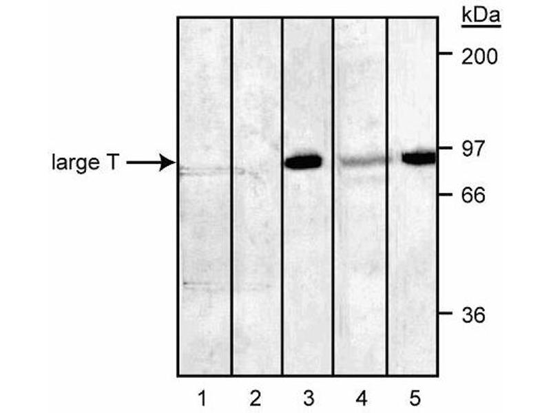 Simian virus 40 is a small DNA virus encoded by 5.2 kb of double-stranded DNA. SV40 large T antigen (T-ag) is a multifunctional ~85 kD phosphoprotein, which is the sole viral protein required for SV40 replication. All other factors are provided by the infected host cell. In addition to its role in SV40 DNA replication, T-ag also causes transformation of susceptible cell lines. Studies of various mutant T-ag proteins have shown that the replication and transformation fractions of T-ag can be separated. The multifunctional nature of this protein has resulted in its use as a model system in a wide variety of disciplines. SV40 T-ag exercises negative regulation on the transcription of SV40 early mRNA by feedback inhibition and exerts positive regulation on transcription from the late promoter. In addition to transcriptional regulation, T-ag is involved in viral DNA replication. Specific biochemical functions required for DNA synthesis that are inherent to the T-ag include high-affinity binding to sites within the viral origin of DNA synthesis, and ATPase and helicase activities. Other functions attributed to T-ag include cellular transformation, induction of cellular DNA synthesis, induction of rRNA synthesis and provision of a host-range function for viral replication. However, all functions of T-ag are influenced by a wide range of post-translational modifications including phosphorylation, glycosylation, acetylation, acylation and adenylation. T-ag exists in monomeric as well as polymeric forms and associates with the tumor suppressor proteins p53 and Rb (retinoblastoma protein). Most of T-ag is transported to the nucleus, while a small fraction is localized at the cell surface. PAb 101 recognizes a C-terminal epitope within the last 190 amino acids of T-ag. PAb 101 was originally known as Clone 7. Studies have suggested that PAb 101 binds the strongest to mature T-ag. PAb 101 (i.e., Clone 7) was developed along with a panel of monoclonal antibodies where SV40-transformed BALB/c mouse cell lines (SVT2 or B4) were used as immunogens. The specificity of the antibody was originally characterized by a variety of techniques using SV40-infected and SV40-transformed cells.
