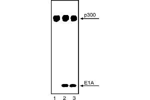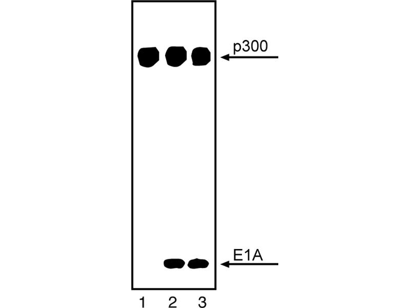 Many serotypes of human adenoviruses (Ad) are able to transform rodent cells in culture because of functions encoded by early region adenovirus 1A (E1A) and 1B (E1B) genes. These virus early gene products bind to specific cellular proteins that normally act to restrict cell growth. The E1A gene, essential for viral replication, encodes protein products with three amino acid regions (1, 2 and 3) conserved among all known adenovirus serotypes. Regions 1 and 2 and the relatively unconserved amino terminus (N) are E1A sequences required for cell growth-regulating functions. The region 2 site binds the retinoblastoma (Rb) and Rb related proteins, p107 and p130. The amino terminal site binds p300, a large cellular DNA binding protein. p300 is a relatively stable, ubiquitously expressed, nuclear phosphoprotein which is conserved among a variety of mammalian species. It is actively synthesized and phosphorylated in both quiescent and proliferating cells. A phosphatase sensitive form with decreased mobility has been identified in M-phase enriched cell populations. Evidence suggests that p300 plays a role in cellular transcription mechanisms. It has sequence-specific DNA binding activity with a consensus DNA binding sequence similar to enhancer elements targeted by the E1A repressor function. The presence of p300 and p300-associated proteins in complexes with the TATA binding protein suggests that p300 has specific interactions with basal transcription mechanisms. Through its association with the TATA regions, p300 may also play a role in the ability of E1A to activate the hsp70 promoter dependent on specific TATA box sequences. p300 migrates at a reduced molecular weight at ~300 kD. Clone NM11 recognizes human p300 a cellular E1A binding protein p300. Specifically, it has been shown to recognize p300 from human, monkey, mouse and rat cell lysates. NM11 will also coprecipitate E1A in association with p300 when E1A is present. Affinity purified p300 was used as immunogen. p300 was affinity purified from 293 human kidney cells (adenovirus type 5 [Ad5] transformed cell line) by co-immunoprecipitation using an E1A-specific monoclonal antibody (M73), which was covalently linked to protein A-Sepharose beads.