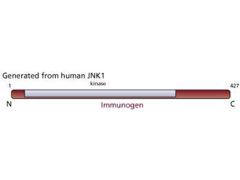 - C-Jun NH2-terminal kinase (JNK) binds to the c-Jun terminal transactivation domain and phosphorylates it on Ser-63 and Ser-73. Phosphorylation enhances the transcriptional activity of c-Jun. The Ser-Pro-acidic sequence targeted by JNK kinase activity establishes it as a prolinedirected kinase related to the MAP kinases and cyclin/dependent kinases. JNK may act as a tumor promoter in response to UV-irradiation since its activity is potently stimulated by radiation. This has relevance to observations that c-Jun transcriptional activity is upregulated by UV irradiation. In addition to UV irradiation, JNK is also activated by some other forms of cellular stress, including heatshock. Both the JNK1 (46 kDa) and JNK2 (54 kDa) isozymes appear equally capable of binding to the c-Jun terminal transactivation domain following induction by UV irradiation or heatshock. G151-666 recognizes both the JNK1 and JNK2 isozymes of JNK1. A bacterially expressed fusion protein of human JNK1 was used as immunogen.