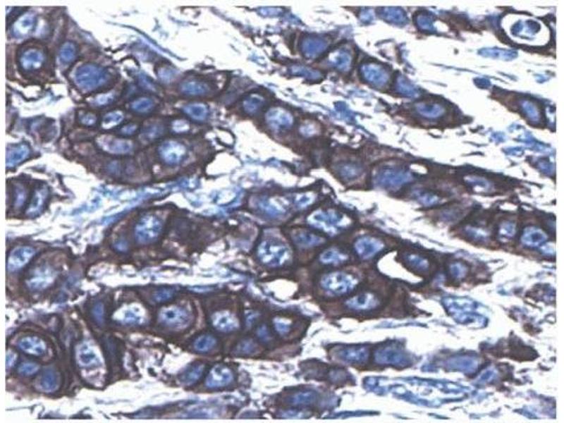 - C-erbB-2 (also known as HER2/neu), a 185 kDa transmembrane glycoprotein, is a member of the type 1 growth factor receptor subfamily which also includes c-erbB-3, c-erbB-4 and the epidermal growth factor receptor (EGFR), also known as c-erbB-1. Members of this receptor subfamily mediate the proliferation and differentiation of normal cells. They have a common structure consisting of an extracellular domain, a transmembrane region, and a cytoplasmic sequence. The extracellular regions contain two cysteine-rich domains, and the intracellular regions have sequence homology to known tyrosine kinases. C-erbB-2 reactivity has been detected in proximal kidney tubules, mucosal epithelium in the gastrointestinal tract, and squamous epithelium in skin. Most normal adult tissues show little or no reactivity with antibodies against c-erbB-2. However, c-erbB-2 is overexpressed in many human breast, stomach, ovary and bladder carcinomas. EGFR, c-erbB-3 and c-erbB-4 are also overexpressed in various human tumor cells, and it is thought that aberrant activation of type 1 growth factor kinase activities may contribute to tumor progression. The antibody 3B5 recognizes human c-erbB-2. A synthetic peptide corresponding to amino acids 1242-1255 (TAENPEYLGLDVPV) in the C-terminal domain of human c-erbB-2 was used as immunogen.