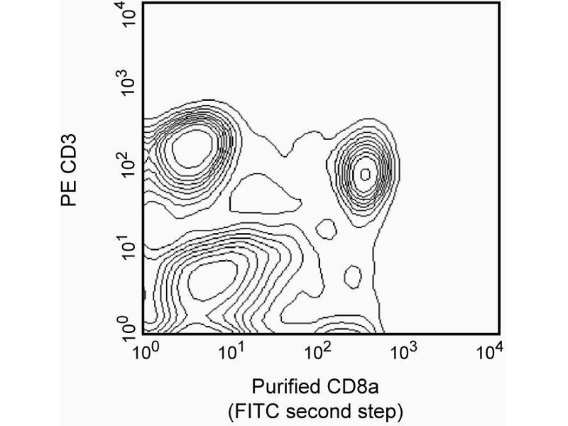 The OX-8 antibody reacts with the hinge-like membrane-proximal domain of the 32 kDa alpha chain of the CD8 differentiation antigen. A truncated CD8 alpha' isoform has not been detected in the rat. The CD8 alpha and beta chains (CD8a and CD8b, respectively) form a heterodimer on the surface of most thymocytes and a subpopulation of mature T lymphocytes (i.e., MHC class I-restricted T cells, including most T suppressor/cytotoxic cells). Intestinal intrapithelial lymphocytes, many CD8+ T cells of athymic rats, many activated CD4+ T cells, and most NK cells express CD8a without CD8b. It has been suggested that the expression of the CD8a/CD8b heterodimer is restricted to thymus-derived T lymphocytes. OX-8 antibody does not react with resting CD4+ T helper cells. CD8 is an antigen coreceptor on the T-cell surface which interacts with MHC class I molecules on antigen-presenting cells. It participates in T-cell activation through its association with the T-cell receptor complex and protein tyrosine kinase Ick. Macrophages have also been reported to express CD8 alpha and beta chains, which are involved in signal transduction. Soluble OX-8 mAb partially blocks in vitro MLR and CTL activity. This antibody is routinely tested by flow cytometric analysis.