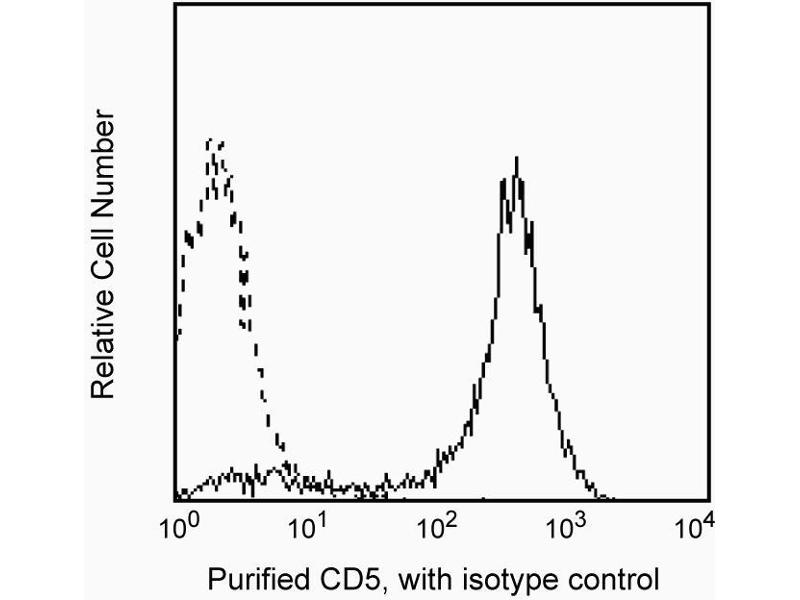 - Reacts with a 67 kDa single-chain transmembrane glycoprotein expressed on most thymocytes, the majority of peripheral T lymphocytes and a subpopulation of B cells. CD72 has been shown to be the natural ligand for CD5. CD5+ B cells produce polyreactive antibodies (mostly IgM). This antibody is routinely tested by flow cytometric analysis.