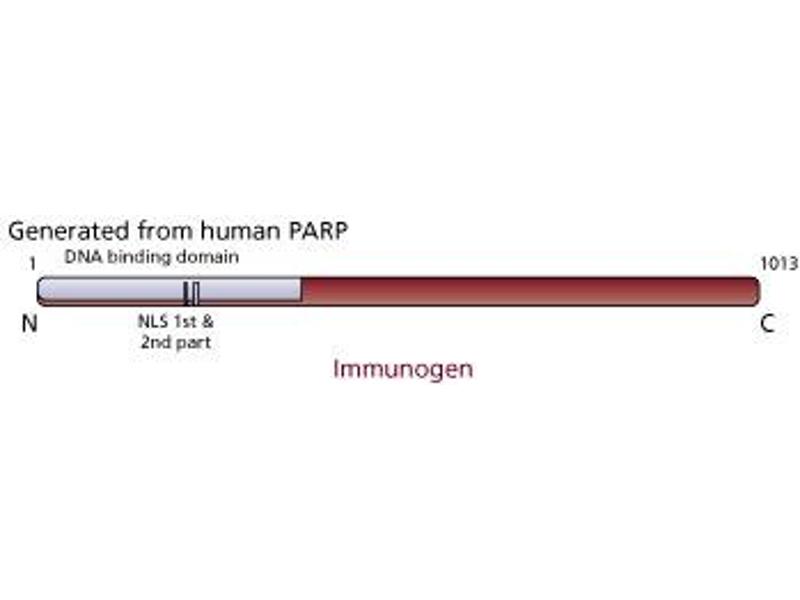 The 4C10-5 antibody has been reported to recognize both native and denatured PARP. Purified human PARP was used as the immunogen and the antibody reported to react with an epitope located in the NAD binding domain. In dot blot assays, the antibody reacts with the native enzyme in the presence or absence of bound DNA as well as after synthesis of covalently linked poly (ADP-ribose). The 4C10-5 antibody is routinely tested by western blot analysis of untreated Jurkat T cells and Jurkat T cells induced to undergo apoptosis. -