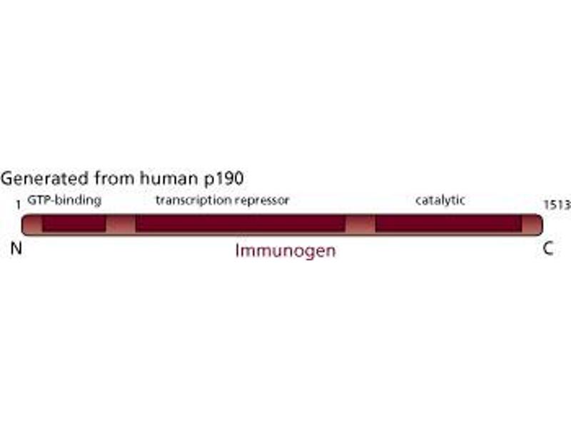 GTPase activating proteins (GAPs) stimulate the GTP-hydrolyzing activity of GTPases, such as p21[ ras]. Ras-GAP (120kDa) is perhaps the best characterized GAP. p190 is a Ras-GAP associated protein that is tyrosine phosphorylated in transformed and growth factor-stimulated cells. Ras-GAP and p190 are targets of oncoproteins and growth factor receptors. Recombinant p190 enhances GTPase activity of the rho family of GTPases. The complete sequence of p190 exhibits three major regions: an N-terminal region with homology to all GTPases, a middle region homologous to transcriptional repressors, and a C-terminal region the is similar to n-chimerin and other small GTPases.