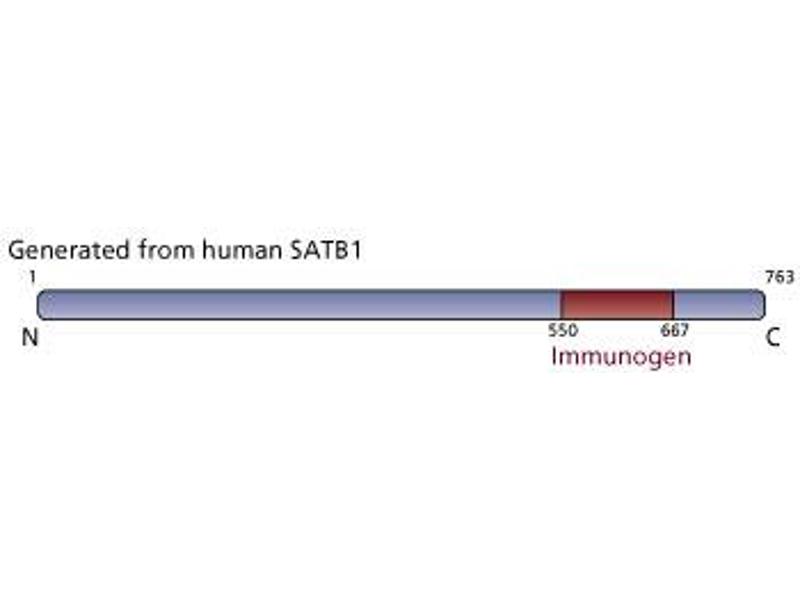 Packaging of fully functional eukaryotic chromosomal DNA within the nucleus requires a highly ordered organizational process. Central to this is the formation of nucleosomes, which consist of octameric histone cores with defined segments of chromatin wound around them, and the interaction of nucleosomes with nuclear matrix components. Such specific genomic DNA segments that interact with the nuclear matrix are called scaffold or matrix attachment regions (SARs or MARs). SATB1 (Special AT-rich sequence-Binding protein 1), expressed predominantly in the thymus, is a homeodomain MAR binding protein. It recognizes ATC sequences that consist of stretches of A's, T's, and C's on one DNA strand. These sequences tend to unwind by extensive base-unpairing in response to negative superhelical strain. SATB1 exclusively binds double stranded DNA in the minor groove with minimal base contact and it has a low affinity for supercoiled DNA. In addition, SATB1 is thought to act as a transcriptional repressor. SATB1 is a MAR binding protein that binds to the base of chromatin loops and may be essential to T cell-specific gene regulation. This antibody is routinely tested by western blot analysis.