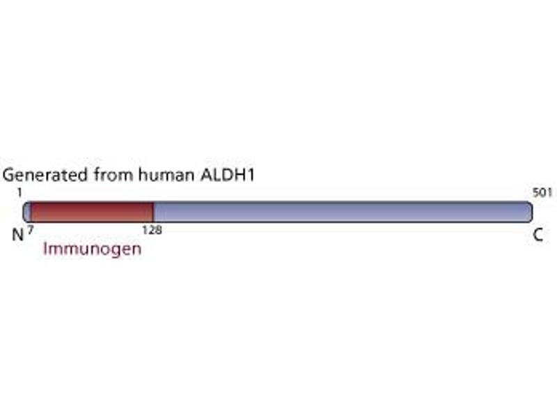 - Aldehyde dehydrogenase (ALDH) is a ubiquitous enzyme located in nearly all mammalian tissues. It catalyzes the irreversible oxidation of a range of aliphatic and aromatic aldehydes to their corresponding carboxylic acids. There are multiple isoforms of ALDH which are subdivided into three classes. Class I includes the cytosolic isoforms. Class II includes the mitochondrial isoforms. Class III includes the microsomal, cytosolic tumor specific, and cytosolic dioxin-inducible forms. At least twelve human ALDH isoforms have been identified. Mutations of many of these proteins such as ALDH1, ALDH2, ALDH4, and ALDH10 have been implicated in multiple human metabolic disorders and clinical abnormalities. At the amino acid level, human ALDH isoforms exhibit a wide range of diversity (15% to about 80%). However, multiple protein regions have been highly conserved and are important for functional activities. A well-characterized member of the human ALDH family is ALDH1. It plays a major role in the biosynthesis of retinoic acid from retinol (vitamin A). Retinoic acid, the biologically active form of retinol, is a regulator of cellular proliferation, differentiation, and survival.