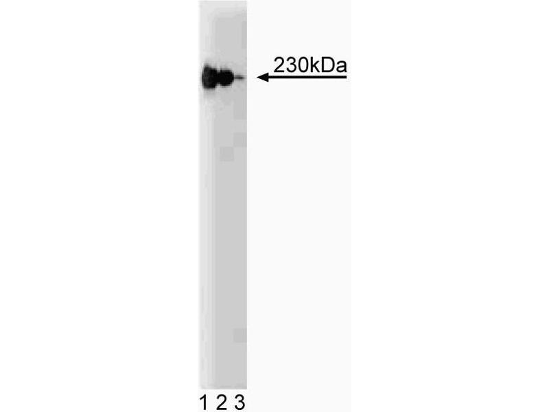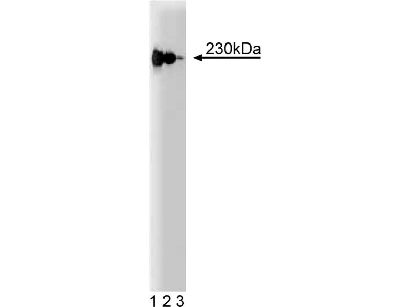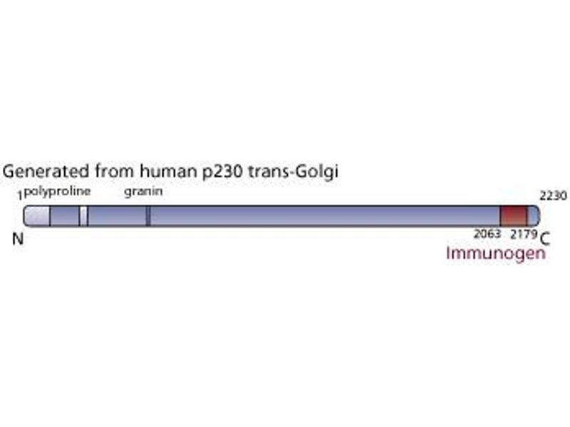 The Golgi apparatus is a very complex and dynamic organelle that functions in protein sorting and modification. Numerous structural and regulatory proteins are involved in the budding, docking, and fusion of Golgi-directed vesicles. p230 trans Golgi is a peripheral membrane protein associated with the cytosolic face of the trans Golgi network (TGN). Protein sequence analysis indicates that it is highly hydrophilic and contains two proline-rich regions, as well as a high frequency of heptad repeats which are characteristic of alpha-helices that form dimeric coiled-coiled structures. Additionally, p230 trans Golgi contains a ESLALEELEL sequence, a motif of the acidic granin proteins that are found in secretory granules of neuroendocrine cells. p230 trans Golgi cycles between the cytosol and the TGN via non-clathrin coated vesicles in a G protein-dependent manner. The localization of p230 trans Golgi to the TGN is dependent on aromatic residues in its C-terminal non-coiled coil domain. Thus, p230 trans-Golgi is aTGN-specific protein that is important for the biogenesis of distinct populations of non-clathrin coated vesicles and, thus, functions in vesicular transport from the TGN. This antibody is routinely tested by western blot analysis.