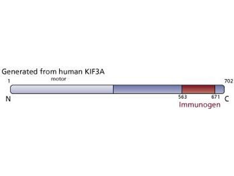 - The ability of the kinesin superfamily of motor proteins to hydrolyze ATP as they move progressively along microtubules is important for organelle transport and cell division. Kinesins are grouped according to the location of the motor domain in the N-terminal, middle, or C-terminal region of the protein. A family of N-terminal motor domain kinesin proteins includes KIF3A/3B, KRP85/95, and Klp68d/64. These proteins form heterodimeric two-headed motors that interact with kinesin associated protein (KAP). The KIF3A/3B/KAP3 heterotrimeric motor has plus-end directed microtubule sliding activity. This heterotrimeric motor is expressed ubiquitously and is used for anterograde transport of membranous organelles. KIF3A- and KIF3B-deficient mice have defects in the formation of the cilia located in the embryonic node. In addition, KIF3A localizes to the basal body of the connecting cilium axoneme and to vesicles at the pre-synaptic ribbon in photoreceptor cells. Thus, KIF3 motors are involved in microtubule-based formation and movement of cilia and the transport of synaptic vesicles. This antibody is routinely tested by the Western blot analysis.