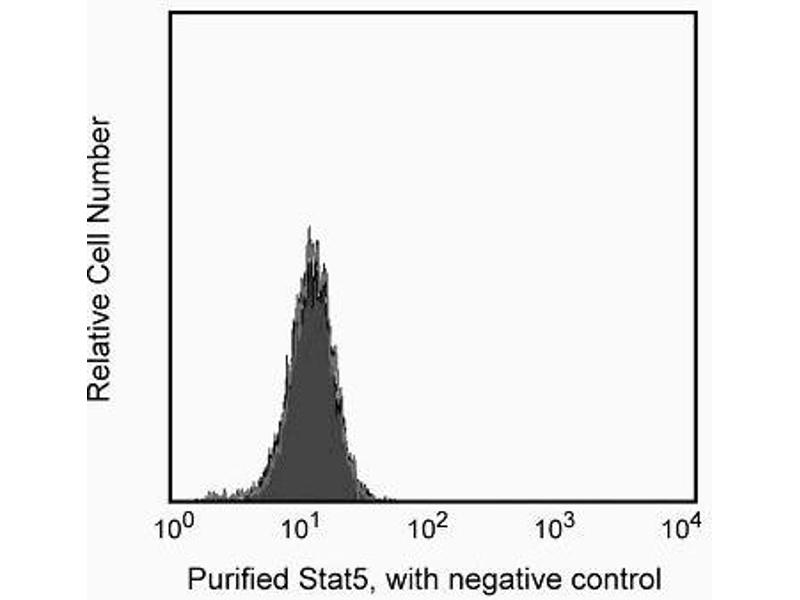 Stat (Signal transducer and activators of transcription) proteins are critical mediators of the biologic activity of cytokines, including interleukins, interferons, erythropoietin, and growth factors. Ligand-receptor interaction leads to activation of constitutively associated JAK family kinases and subsequent recruitment/activation of Stat proteins by tyrosine phosphorylation. Active Stat proteins then move to the nucleus to promote transcription of cytokine-inducible genes. Seven Stat proteins have been cloned, each of which is differentially expressed and/or activated in a cytokine-specific and cell type-specific manner. Stat5 has been characterized and shown to be encoded by two separate genes, Stat5a and Stat5b that share over 90% identity at the amino acid level. Stat5a has been shown to be involved in lactogenesis and mammary development, while Stat5b has been shown to be involved in growth hormone signaling and to play a role in liver gene expression. Both Stat5a and Stat5b share similarities, both are involved in IL-2 induced peripheral T cell proliferation. The peptide hormone, prolactin, binds to the prolactin receptor (PRLR) to initiate the lactogenic response. There are at least three forms of PRLR, however, only the long form is able to activate the 92-kDa Stat5 protein by inducing phosphorylation at Y694. Once phosphorylated, Stat5 becomes an essential transcription factor which binds to the beta-casein gene promoter. The presence of an SH2 domain within Stat5 suggests that it may directly interact with protein tyrosine kinases (PTKs) such as JAK2.