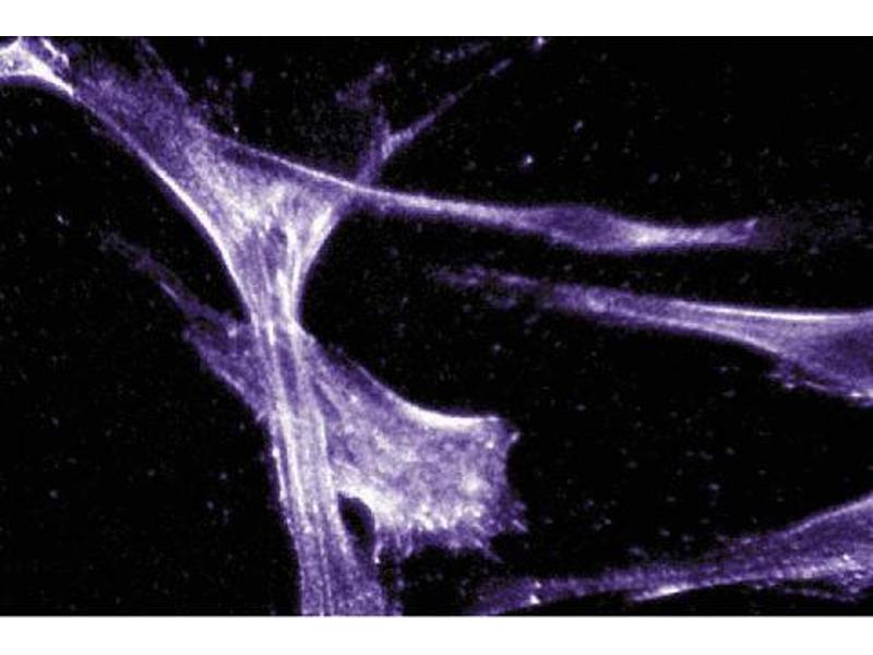 - Changes in cellular morphology, adhesion, and motility occur through the reorganization of the actin cytoskeleton. This reorganization of actin filaments results from interactions between actin and actin-binding proteins. Actin is a 42-kDa protein that is known as G-actin in its monomeric form. Polymerization of G-actin monomers leads to the generation of flexible filaments, 5-9 nm in diameter, called F-actin. F-actin may be organized in linear bundles called stress fibers or in two-dimensional networks. The latter are highly concentrated beneath the plasma membrane and form the actin cortex. Regulation of actin cytoskeletal dynamics occurs through actin-binding proteins. These proteins bind to G- and/or F-actin and regulate various aspects of actin cytoskeletal dynamics, such as polymerization and depolymerization of actin, cross-linking of actin filaments into bundles, interaction of actin-based structures with membranes and other cytoskeletal elements, and locomotion of actin-based structures. Thus, the actin cytoskeleton is a complex matrix consisting of G- and F-actin along with the multitude of interactions between these actin forms and a variety of different types of actin-binding proteins. The C4 monoclonal antibody reacts with all known isoforms of actin in vertebrate muscle and non-muscle cells.