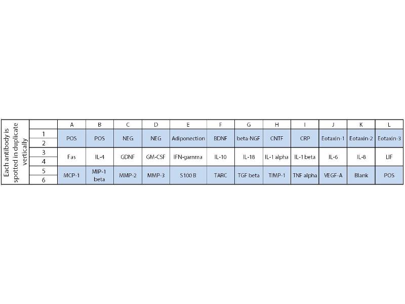 - Adiponectin (ACRP30), BDNF, beta-NGF, CNTF, CRP (C-Reactive Protein), Eotaxin-1 (CCL11), Eotaxin-2 (MPIF-2/CCL24), Eotaxin-3 (CCL26), Fas (TNFRSF6/Apo-1), IL-4, GDNF, GM-CSF, IFN-gamma, IL-10, IL-18, IL-1 alpha (IL-1 F1), IL-1 beta (IL-1 F2), IL-6, IL-8 (CXCL8), LIF, MCP-1 (CCL2), MIP-1 beta (CCL4), MMP-2, MMP-3, S100 B, TARC (CCL17), TGF beta 1, TIMP-1, TNF alpha, VEGF-A