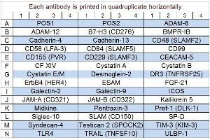 - ADAM-12, ADAM-8, B7-H3 (CD276), BMPR-IB, Cadherin-13, Cadherin-4, CD155 (PVR), CD229 (SLAMF3), CD48 (SLAMF2), CD58 (LFA-3), CD84 (SLAMF5), CD99, CEACAM-5, Coagulation Factor XIV (Protein C), Cystatin A, Cystatin B, Cystatin E/M, Desmoglein-2, DR3 (TNFRSF25), ErbB4 (HER4), ESAM, FGF-21, Galectin-2, Galectin-9, ICOS, JAM-A (CD321/F11R), JAM-B (VE-JAM/CD322), Kallikrein 5, Midkine, Pentraxin-3 (TSG-14), Pref-1 (DLK-1/FA1), Siglec-10, SLAM (CD150), SP-D, Syndecan-4, Testican 2 (SPOCK2), TIM-3 (KIM-3), TLR4, TRAIL (TNFSF10), ULBP-1