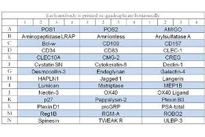 - ADP-Ribosyl Cyclase 2 (BST-1/CD157), AmiGO, Aminopeptidase LRAP (ERAP2), Amnionless, Arylsulfatase A (ARSA), bcl-w, CD109, CD34, CD83, CLEC-1, CLEC10A (CD301), CMG-2 (ANTXR2), CREG, Cystatin SN, Cytokeratin 8 (KRT8), Dectin-1 (CLEC7A), Desmocollin-3, Endoglycan (PODXL2), Galectin-4, HAPLN1, Jagged 1, Langerin (CD207), Lumican, Matriptase (ST14), Meprin beta (MEP1B), Nectin-3, OX40 (TNFRSF4), OX40 Ligand (TNFSF4), p27/Kip1 (CDKN1B), PAPP-A2, Plexin B3, Plexin D1, ProGRP, PSA-total, Reg1B, RGM-A, ROBO2, Spinesin, TWEAK R (TNFRSF12), ULBP-3
