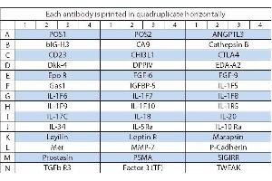 - ANGPTL3, beta IG-H3, CA9, Cathepsin B, CD23, CD26 (DPPIV), CHI3L1, Coagulation Factor III (Tissue Factor/Thromboplastin), CTLA-4 (CD152), Dkk-4, EDA-A2, Erythropoietin R, FGF-6, FGF-9, FOLH1 (PSMA), Gas 1, IGFBP-5, IL-1 F10 (IL-1HY2), IL-1 F5 (FIL1 delta), IL-1 F6 (FIL1 epsilon), IL-1 F7 (FIL1 zeta), IL-1 F8 (FIL1 eta), IL-1 F9 (IL-1 H1), IL-1 R5 (IL-18 R alpha), IL-10 R alpha, IL-17C, IL-18, IL-20, IL-34, IL-5 R alpha, Layilin, Leptin R, Marapsin, Mer, MMP-7, P-Cadherin, Prostasin, SIGIRR, TGF beta R3, TWEAK (TNFSF12)