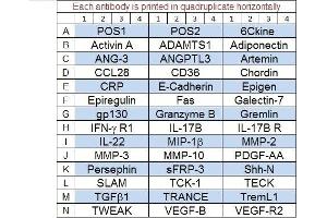 - 6Ckine (CCL21), Activin A, ADAMTS-1 (METH1), Adiponectin (ACRP30), Angiopoietin-3 (ANGPTL1), ANGPTL3, Artemin, CCL28 (MEC), CD36 (SR-B3), Chordin, CRP (C-Reactive Protein), E-Cadherin, Epigen, Epiregulin, Fas (TNFRSF6/Apo-1), Galectin-7, gp130, Granzyme B, Gremlin-1, IFN-gamma R1, IL-17 RB, IL-17B, IL-22, MIP-1 beta (CCL4), MMP-10, MMP-2, MMP-3, PDGF-AA, Persephin, sFRP-3, SLAM (CD150), Sonic Hedgehog N-Terminal (Shh-N), TCK-1 (CXCL7), TECK (CCL25), TGF beta 1, Trance (TNFSF11), TREML1 (TLT-1), TWEAK (TNFSF12), VEGF-B, VEGFR2