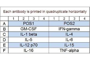 - GM-CSF, IFN-gamma, IL-1 beta (IL-1 F2), IL-4, IL-5, IL-6, IL-12 p70, IL-15, IL-16, TNF alpha