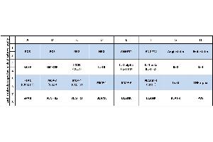 - Angiopoietin-1, Angiopoietin-2, Angiostatin, Endostatin, GCSF, GM-CSF, I-309 (TCA-3/CCL1), IL-10, IL-1 alpha (IL-1 F1), IL-1 beta (IL-1 F2), IL-2, IL-4, I-TAC (CXCL11), MCP-3 (MARC/CCL7), MCP-4 (CCL13), MMP-1, MMP-9, PECAM-1 (CD31), Tie-2, TNF alpha, uPAR, VEGFR2, VEGFR3