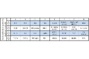 - Eotaxin-1 (CCL11), Fas Ligand (TNFSF6), bFGF, GCSF, GM-CSF, IFN-gamma, IGF-2, IL-1 alpha (IL-1 F1), IL-1 beta (IL-1 F2), IL-12 p40/p70, IL-12 p70, IL-13, IL-6, IL-9, Leptin, MCP-1 (CCL2), M-CSF, MIG (CXCL9), Platelet Factor 4 (CXCL4), TIMP-1, TIMP-2, TNF alpha, Thrombopoietin (TPO), VEGF-A