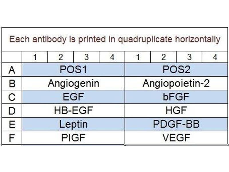 - Angiogenin, Angiopoietin-2, EGF, bFGF, HB-EGF, HGF, Leptin, PDGF-BB, PLGF, VEGF-A