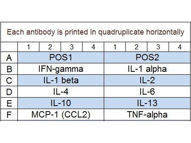 Quantibody® Rat Inflammation Array 1 detects: IFNgamma, IL-1alpha, IL-1beta, IL-2, IL-4, IL-6, IL-10, IL-13, MCP-1, TNFalpha