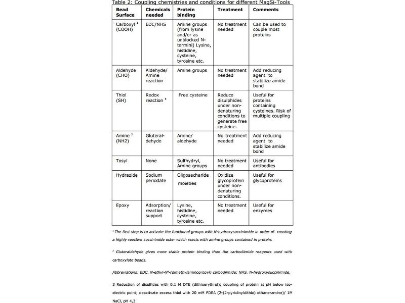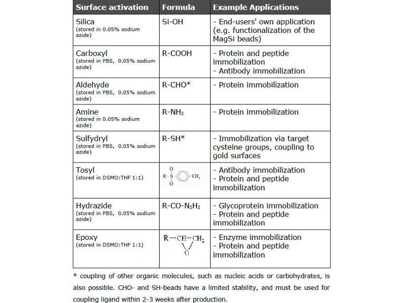 MagSi-Tools are surface activated magnetic particles, intended for covalent immobilization of proteins (e.g. antibodies, enzymes), peptides, nucleic acids or other molecules of interest. Different surface modifications and bead sizes allow for choosing the optimal product for the right molecule to be coupled, and for the intended application. Please take into consideration which groups are available on the ligand for coupling, and try to prevent inactivation or hiding the active or exposed site of the ligand. After coupling the molecule of interest (ligand) is coupled to the magnetic particles, the resulting beads can be used in downstream applications such as: - Isolating specific target proteins, antibodies, nucleic acids, cells, viruses, etc. (preparative applications) - Detecting specific target proteins, nucleic acids, cells, viruses, etc. (diagnostic applications) - Immobilizing enzymes, thereby enhancing stability and minimizing auto-catalysis. Magnetic collection of the particle/enzyme complex allows to remove the enzyme from the reaction, and to reuse it in a new reaction.