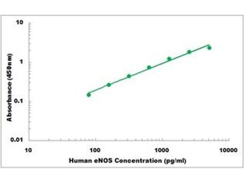 NOS3 Reactivité: Humain Colorimetric Sandwich ELISA 0.15 ng/mL - 10 ng/mL Cell Culture Supernatant, Cell Lysate, Plasma, Serum, Tissue Homogenate