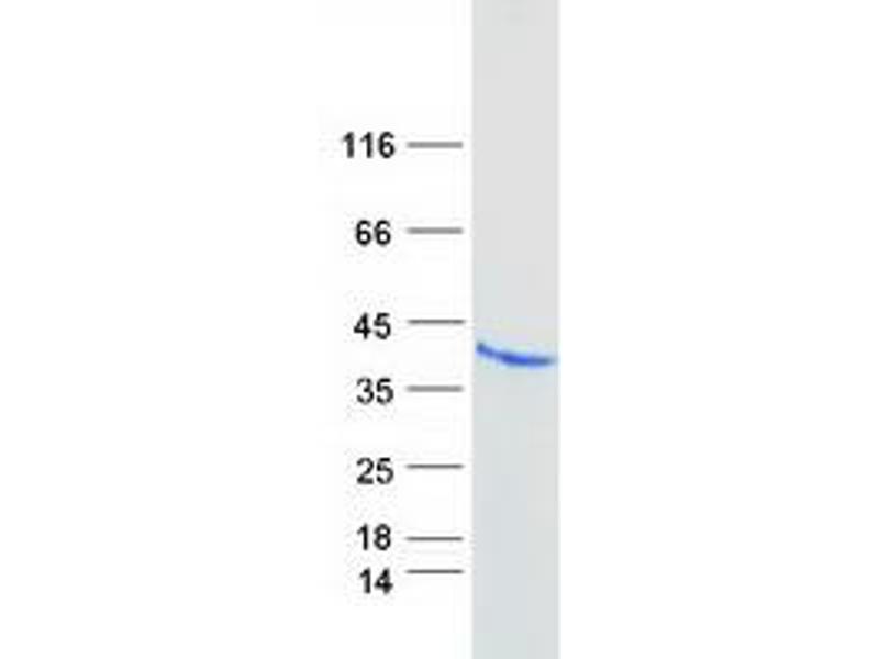 The purity of the protein is greater than 95 % as determined by SDS-PAGE and Coomassie blue staining.