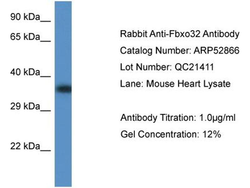 FBXO32 Reactivité: Humain, Rat, Souris, Boeuf (Vache), Chien, Cheval, Lapin, Cobaye, Poisson zèbre (Danio rerio) WB Hôte: Lapin Polyclonal unconjugated