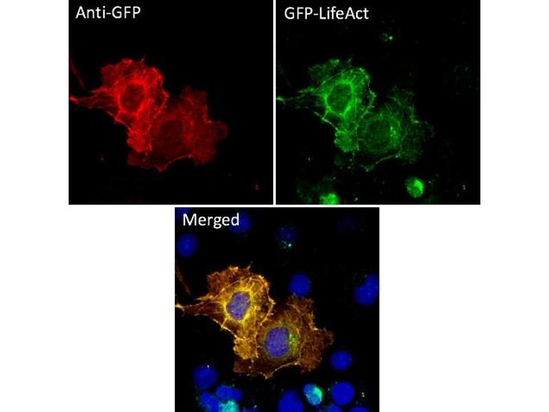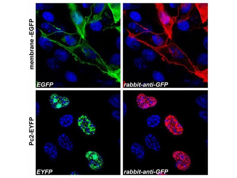 Immunofluorescence and microscopy: GFP antibodies are utilized in immunofluorescence experiments to visualize and localize GFP-tagged proteins within fixed cells or tissues. By using secondary antibodies conjugated to fluorophores, such as Alexa Fluor or DyLight dyes, the GFP antibodies can be detected and visualized under a fluorescence microscope. This technique enables researchers to study protein localization, interactions, and dynamics in real-time.
