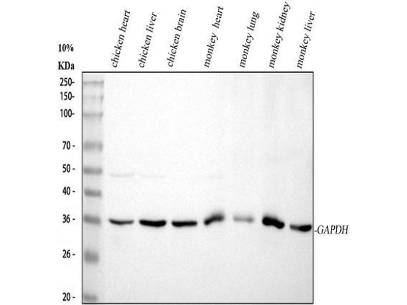 GAPDH Reactivité: Humain, Souris, Rat, Lapin, Porc, Singe, Chien, Poisson zèbre (Danio rerio), Cheval, Cobaye WB Hôte: Lapin Polyclonal unconjugated