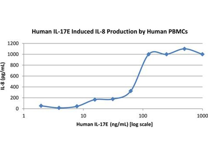 The protein encoded by this gene is a cytokine that shares sequence similarity with interleukin 17. This cytokine can induce NF-kappaB activation, and stimulate the production of interleukin 8. Both this cytokine and interleukin 17B are ligands for the cytokine receptor IL17BR. Studies of a similar gene in mice suggest that this cytokine may be a pro-inflammatory cytokine favoring the Th2-type immune response. Alternative splicing results in multiple transcript variants. [provided by RefSeq, Mar 2010].
