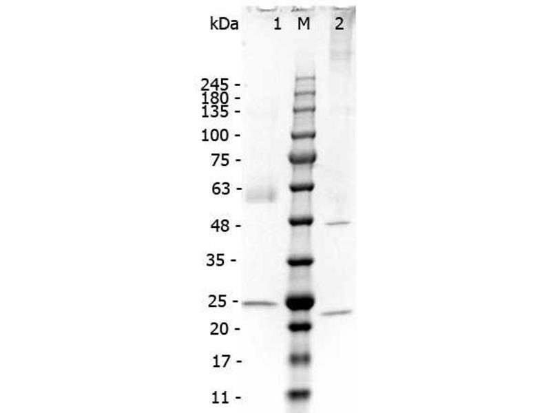 - Assay by immunoelectrophoresis resulted in a single precipitin arc against anti-Mouse IgA alpha and anti-Mouse serum. Isotyping assay resulted non-reactive with antisera to mouse IgG1, IgG2a, IgG2b, IgG3, IgM. SDS-PAGE shows a band at 60 kDa corresponding to alpha heavy chain.