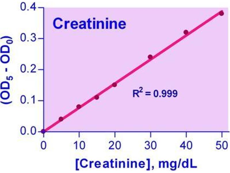 Creatinine is synthesized in the body at a fairly constant rate from creatine, which is produced during muscle contractions from creatine phosphate. In the blood, creatinine is removed by filtration through the glomeruli of the kidney and is secreted into urine. In healthy individuals, creatinine secretion is independent of diet and is fairly constant. The creatinine clearance test has become one of the most sensitive tests for measuring glomerular filtration rate. In kidney disease, creatinine levels in the blood are elevated, whereas the creatinine clearance rate and hence the urine levels are diminished. Creatinine test is most widely used to assess kidney function. Simple, direct and automation-ready procedures for measuring creatinine concentration in biological samples are becoming popular in Research and Drug Discovery. This creatinine assay kit is designed to measure creatinine directly in biological samples without any pretreatment. The improved Jaffe method utilizes picrate that forms a red colored complex with creatinine. The intensity of the color, measured at 510nm, is directly proportional to creatinine concentration in the sample. The optimized formulation substantially reduces interference by substances in the raw sample.