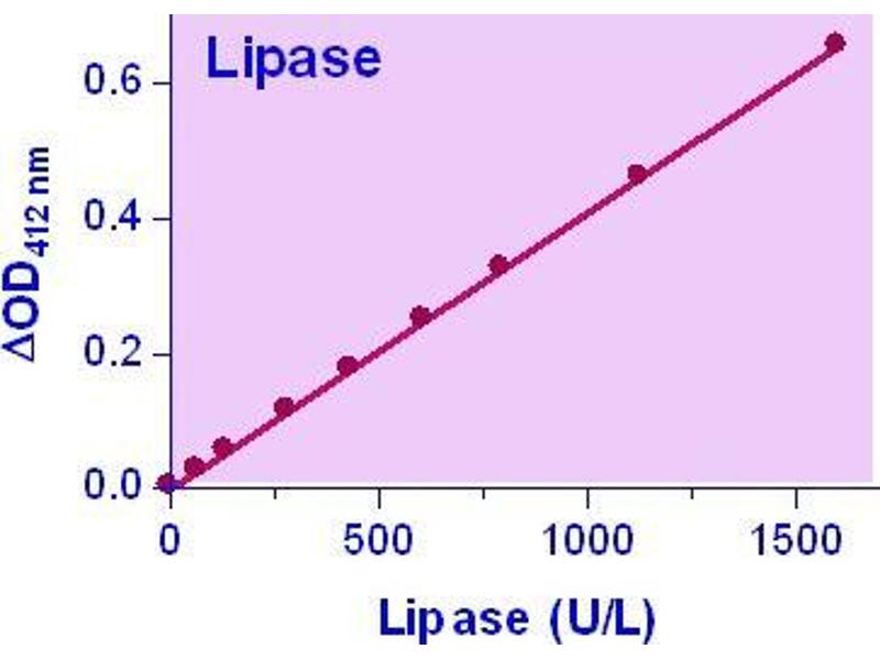 Sensitive and accurate. Linear detection range 40 to 1600 U/L lipase activity in 96-well plate assay.