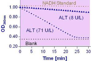 Alanine Transaminase (ALT), also known as serum alanine aminotransferase (ALAT) or pyruvic transaminase (SGPT), facilitates the conversion of alanine and -ketoglutarate to pyruvate and glutamate. ALT plays an important role in gluconeogenesis and amino acid metabolism. ALT is found mainly in the liver, and, to a lesser extent, in kidney, heart, muscle, and pancreas tissues. Normal serum levels of ALT are low, and increased serum ALT activity is widely used as a marker for liver damage. Simple, direct and automation-ready procedures for measuring ALT activity find wide applications in research and drug discovery. This ALT activity assay is based on the quantification of pyruvate produced by ALT. In this assay, pyruvate and NADH are converted to lactate and NAD by the enzyme lactate dehydrogenase (LDH). The decrease in NADH absorbance at 340 nm is proportional to ALT activity.