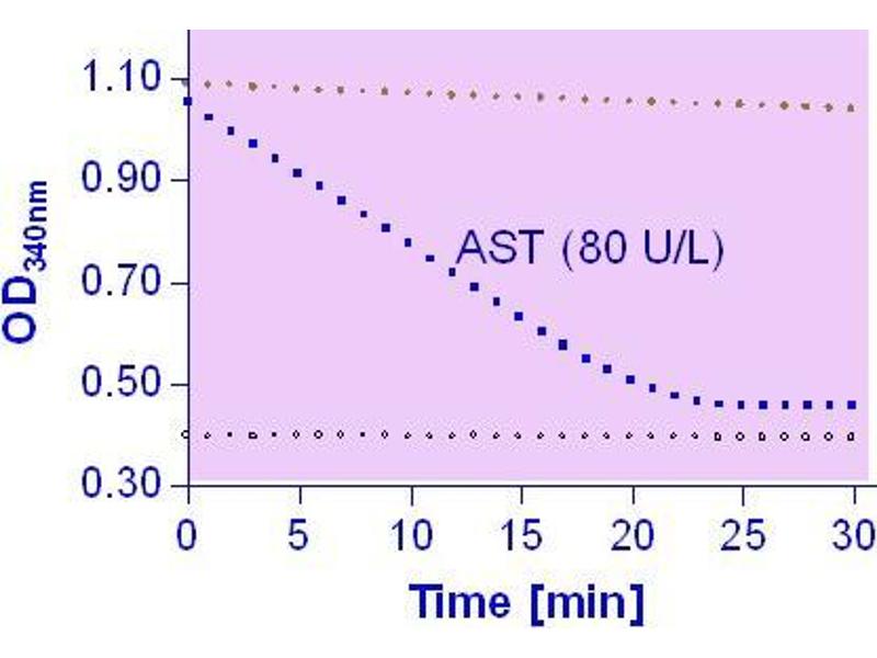 Aspartate Transaminase (AST), also known as serum glutamic oxaloacetic transaminase (GOT) or aspartate aminotransferase (ASAT/AAT), facilitates the conversion of aspartate and alpha-ketoglutarate to oxaloacetate and glutamate. There are two isoenzymes in humans: GOT1 is a cytosolic isoenzyme derived from red blood cells and heart, GOT2 is the mitochondrial isoenzyme found mainly in the liver. AST is elevated in liver and muscle diseases. It is part of diagnostic tests for liver function, myocardial infarction, acute pancreatitis, acute hemolytic anemia, severe burns, acute renal disease and trauma. Simple, direct and automation-ready procedures for measuring AST activity find wide applications in research and drug discovery. This AST activity assay is based on the quantification of oxaloacetate produced by AST. In this assay, oxaloacetate and NADH are converted to malate and NAD by the enzyme malate dehydrogenase. The decrease in NADH absorbance at 340 nm is proportionate to AST activity.