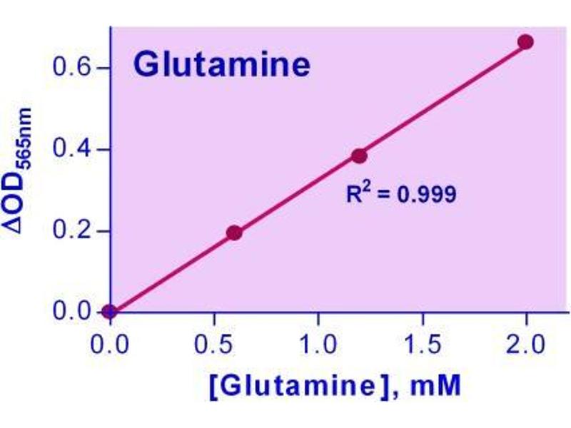 Glutamine is an amino acid synthesized in the muscle that plays major roles in protein synthesis, acid-base balance, anabolic processes and is utilized for cellular energy and as a carbon source. It is used in treatment of injury, trauma, burns, and also as a supplement for muscle growth and post-surgery healing. Simple, direct and automation-ready procedures for measuring glutamine concentration are very desirable. This glutamine assay kit is based on hydrolysis of glutamine to glutamate and colorimetric determination of the product. The intensity of the product color, measured at 565 nm, is proportional to the glutamine concentration in the sample.