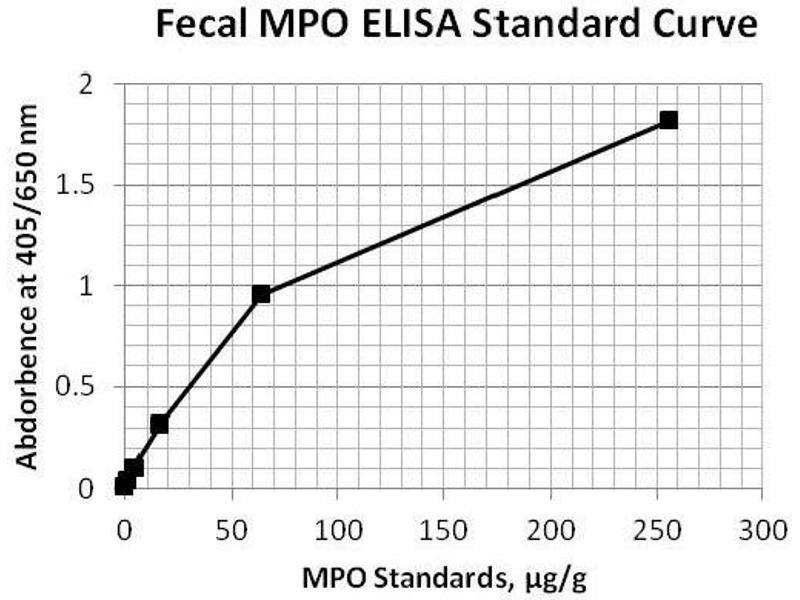 - This ELISA kit is designed, developed and produced for the quantitative measurement of human myeloperoxidase in stool samples. The assay utilizes the two-site sandwich technique with selected antibodies that bind to different epitopes of myeloperoxidase.Assay standards, controls and extracted patient samples are added directly to wells of a microtiter plate that is coated with antibody to myeloperoxidase. After an incubation period, the plate is washed and horseradish peroxidase (HRP)-conjugated human myeloperoxidase antibody is added to each well. After the second incubation period, a sandwich of solid-phase monoclonal antibody human myeloperoxidase HRP-conjugated antibody is formed. The unbound antibodies and buffer matrix are removed in the subsequent washing step. For the detection of this immunocomplex, the well is then incubated with a substrate solution in a timed reaction and the absorbances are then measured in a spectrophotometric microplate reader. The enzymatic activity of the immunocomplex bound to the wall of each microtiter well is directly proportional to the amount of human myeloperoxidase in the test sample. A standard curve is generated by plotting the absorbance versus the respective human myeloperoxidase concentration for each standard on a point-to-point or 4-parameter curve fitting. The concentration of human myeloperoxidase in test samples is determined directly from this standard curve.