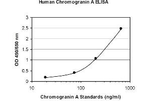 - Assay standards, controls and patient samples are added directly to wells of microplate that is coated with a polyclonal chromogranin A antibody. After the first incubation period, the antibody on the wall of microtiter well captures human chromogranin A in the sample and unbound protein in each microtiter well is washed away. Then a horseradish peroxidase (HRP)-labeled monoclonal anti-human chromogranin A antibody is added to each microtiter well and a sandwich of monoclonal antibody - human chromogranin A polyclonal antibody is formed. The unbound monoclonal antibody is removed in the subsequent washing step. For the detection of this immunocomplex, the well is incubated with a substrate solution in a timed reaction and then measured in a spectrophotometric microplate reader. The enzymatic activity of the immunocomplex bound to the chromogranin A on the wall of the microtiter well is directly proportional to the amount of chromogranin A in the sample. A standard curve is generated by plotting the absorbance versus the respective human chromogranin A concentration for each standard with a 4 parameter curve fit. The concentration of human chromogranin A in test samples is determined directly from this standard curve.
