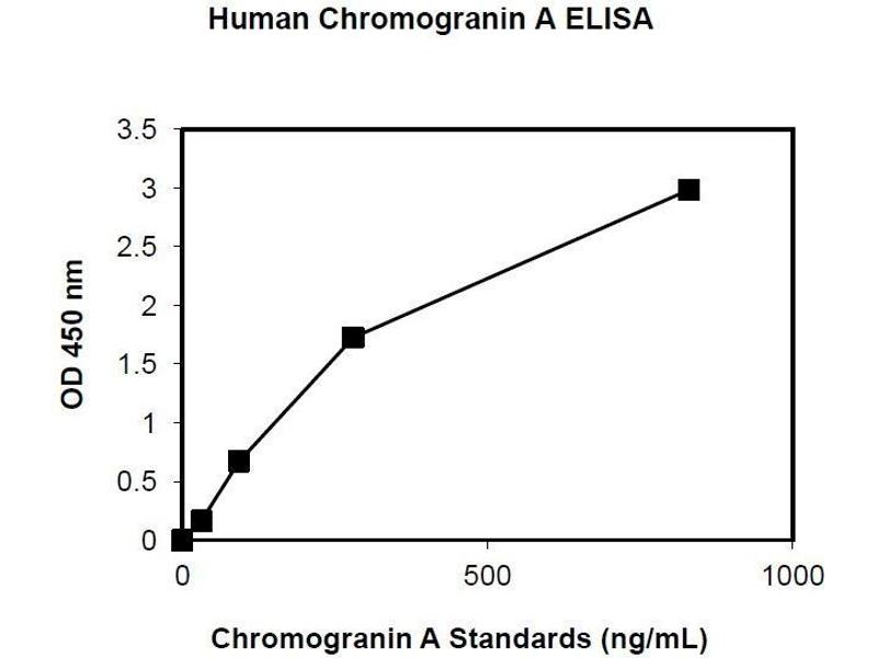 - Assay standards, controls and patient samples are added directly to wells of microplate that is coated with a polyclonal chromogranin A antibody. After the first incubation period, the antibody on the wall of microtiter well captures human chromogranin A in the sample and unbound protein in each microtiter well is washed away. Then a horseradish peroxidase (HRP)-labeled monoclonal anti-human chromogranin A antibody is added to each microtiter well and a sandwich of monoclonal antibody human chromogranin A polyclonal antibody is formed. The unbound monoclonal antibody is removed in the subsequent washing step. For the detection of this immunocomplex, the well is incubated with a substrate solution in a timed reaction and then measured in a spectrophotometric microplate reader. The enzymatic activity of the immunocomplex bound to the chromogranin A on the wall of the microtiter well is directly proportional to the amount of chromogranin A in the sample. A standard curve is generated by plotting the absorbance versus the respective human chromogranin A concentration for each standard on point-to-point or cubical scales or 4 parameter curve fits. The concentration of human chromogranin A in test samples is determined directly from this standard curve.