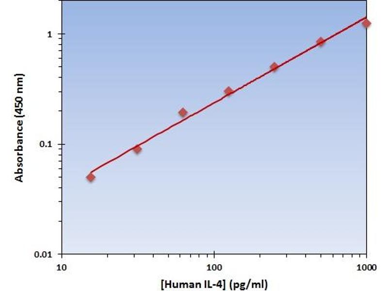 - This particular immunoassay utilizes the quantitative technique of a Sandwich Enzyme-Linked Immunosorbent Assay (ELISA) where the target protein (antigen) is bound in a sandwich format by the primary capture antibodies coated to each well-bottom and the secondary detection antibodies added subsequently by the investigator. The capture antibodies coated to the bottom of each well are specific for a particular epitope on the Human IL-4 cytokine while the user-added detection antibodies bind to epitopes on the bound target protein. Amid each step of the procedure, a series of wash steps must be performed to ensure the elimination of non-specific binding between proteins to other proteins or to the solid phase. After incubation and sandwiching of the target antigen, a peroxidase enzyme is conjugated to the constant heavy chain of the secondary antibody (either covalently or via Avidin/Streptavidin-Biotin interactions), allowing for a colorimetric reaction to ensue upon substrate addition. When the substrate TMB (3, 3’, 5, 5’- Tetramethylbenzidine) is added, the reaction catalyzed by peroxidase yields a blue color that is representative of the antigen concentration. Upon sufficient color development, the reaction can be terminated through addition of Stop Solution (2 N Sulfuric Acid) where the color of the solution will turn yellow. The absorbance of each well can then be read by a spectrophotometer, allowing for generation of a standard curve and subsequent determination of protein concentration.