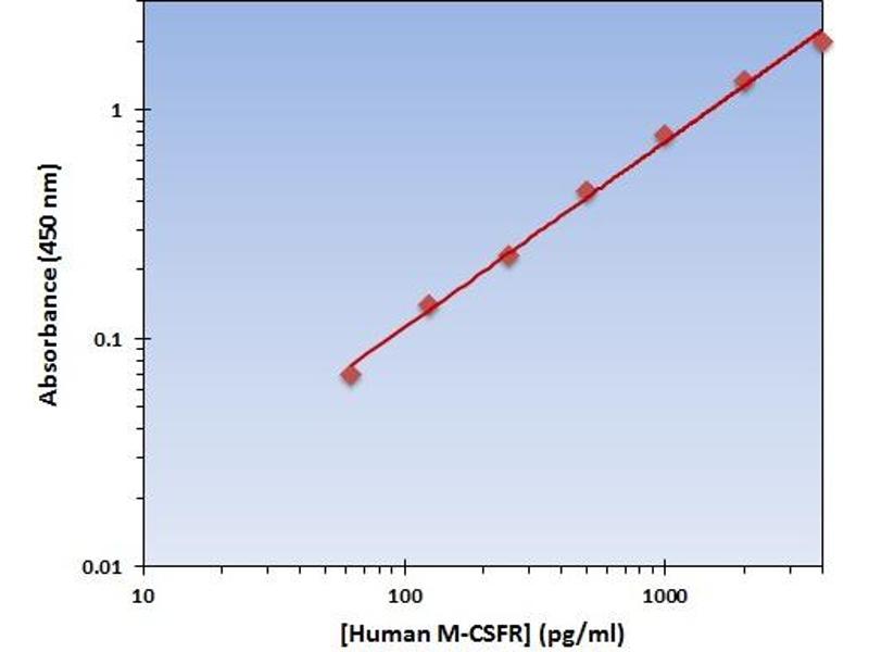 - This particular immunoassay utilizes the quantitative technique of a Sandwich Enzyme-Linked Immunosorbent Assay (ELISA) where the target protein (antigen) is bound in a sandwich format by the primary capture antibodies coated to each well-bottom and the secondary detection antibodies added subsequently by the investigator. The capture antibodies coated to the bottom of each well are specific for a particular epitope on the Human M-CSFR cytokine while the user-added detection antibodies bind to epitopes on the captured target protein. Amid each step of the procedure, a series of wash steps must be performed to ensure the elimination of non-specific binding between proteins to other proteins or to the solid phase. After incubation and sandwiching of the target antigen, a peroxidase enzyme is conjugated to the constant heavy chain of the secondary antibody (either covalently or via Avidin/Streptavidin-Biotin interactions), allowing for a colorimetric reaction to ensue upon substrate addition. When the substrate TMB (3, 3’, 5, 5’-Tetramethylbenzidine) is added, the reaction catalyzed by peroxidase yields a blue color that is representative of the antigen concentration. Upon sufficient color development, the reaction can be terminated through addition of Stop Solution (2 N Sulfuric Acid) where the color of the solution will turn yellow. The absorbance of each well can then be read by a spectrophotometer, allowing for generation of a standard curve and subsequent determination of protein concentration.