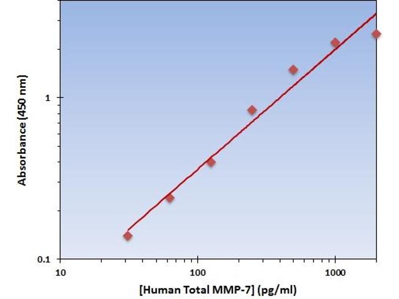 - The OmniKine? Human Total MMP-7 ELISA Kit contains the components necessary for quantitative determination of natural or recombinant Human Total MMP-7 concentrations within any experimental sample including cell lysates, serum and plasma. This particular immunoassay utilizes the quantitative technique of a "Sandwich" Enzyme- Linked Immunosorbent Assay (ELISA) where the target protein (antigen) is bound in a "sandwich" format by the primary capture antibodies coated to each well-bottom and the secondary detection antibodies added subsequently by the investigator. The capture antibodies coated to the bottom of each well are specific for a particular epitope on Human Total MMP-7 while the user-added detection antibodies bind to epitopes on the captured target protein. Amid each step of the procedure, a series of wash steps must be performed to ensure the elimination of non-specific binding between proteins to other proteins or to the solid phase. After incubation and "sandwiching" of the target antigen, a peroxidase enzyme is conjugated to the constant heavy chain of the secondary antibody (either covalently or via Avidin/Streptavidin-Biotin interactions), allowing for a colorimetric reaction to ensue upon substrate addition. When the substrate TMB (3, 3', 5, 5'-Tetramethylbenzidine) is added, the reaction catalyzed by peroxidase yields a blue color that is representative of the antigen concentration. Upon sufficient color development, the reaction can be terminated through addition of Stop Solution (2 N Sulfuric Acid) where the color of the solution will turn yellow. The absorbance of each well can then be read by a spectrophotometer, allowing for generation of a standard curve and subsequent determination of protein concentration.