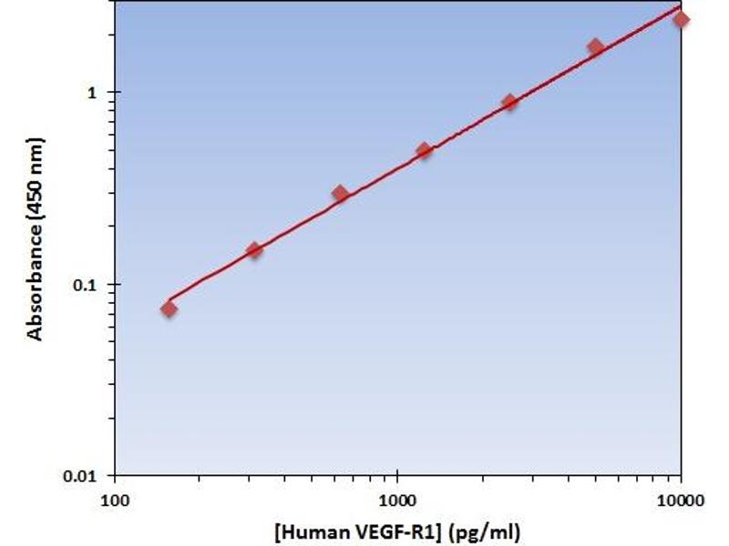 - Human VEGF-R1 is a receptor for VEGF, VEGFB and PGF that has tyrosine-protein kinase activity. The VEGF-kinase ligand/receptor signaling system plays a key role in vascular development and regulation of vascular permeability. Isoform SFlt1 may have an inhibitory role in angiogenesis. This receptor interacts in vitro with various phosphotyrosine-binding proteins, including PLC-gammas, PTPN11, GRB2, CRK and NCK1. In addition, it interacts with GNB2L1/RACK1. VEGF-R1 is mostly found in normal lung, but also in placenta, liver, kidney, heart and brain tissues. It is specifically expressed in most of the vascular endothelial cells, and also expressed in peripheral blood monocytes. It is not expressed in tumor cell lines. In contrast, isoform sFlt1 is strongly expressed in placenta. VEGF-R1 belongs to the protein kinase superfamily, Tyr protein kinase family, and CSF-1/PDGF receptor subfamily and contains 7 Ig-like C2-type (immunoglobulin-like) domains along with 1 protein kinase domain. This gene encodes a member of the vascular endothelial growth factor receptor (VEGFR) family. VEGFR family members are receptor tyrosine kinases (RTKs) which contain an extracellular ligand-binding region with seven immunoglobulin (Ig)-like domains, a transmembrane segment, and a tyrosine kinase (TK) domain within the cytoplasmic domain. This protein binds to VEGFR-A, VEGFR-B and placental growth factor and plays an important role in angiogenesis and vasculogenesis. Expression of this receptor is found in vascular endothelial cells, placental trophoblastic cells and peripheral blood monocytes. Multiple transcript variants encoding different isoforms have been found for this gene. Isoforms include a full- length transmembrane receptor isoform and shortened, soluble isoforms. The soluble isoforms are associated with the onset of pre-eclampsia. Source: Entrez Gene, Swiss-Prot