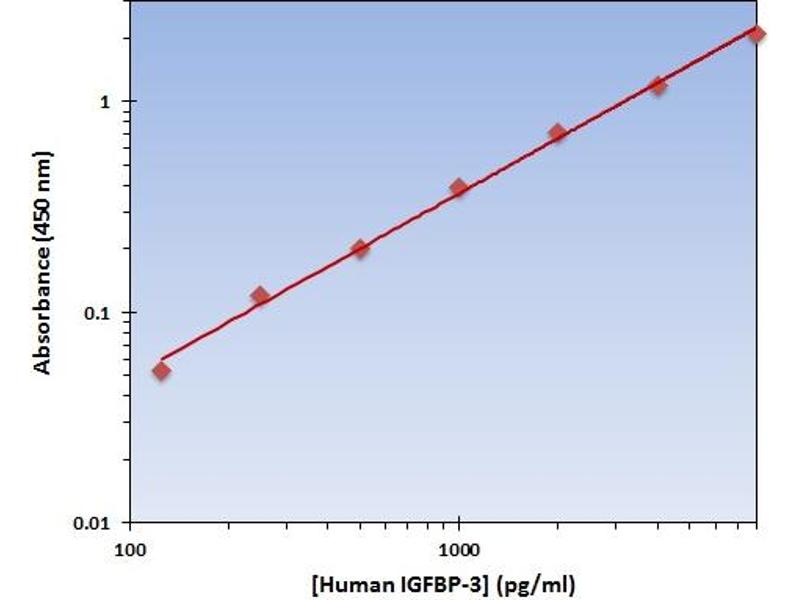 - The OmniKine? Human IGFBP-3 ELISA Kit contains the components necessary for quantitative determination of natural or recombinant Human IGFBP-3 concentrations within any experimental sample including cell lysates, serum and plasma. This particular immunoassay utilizes the quantitative technique of a "Sandwich" Enzyme- Linked Immunosorbent Assay (ELISA) where the target protein (antigen) is bound in a "sandwich" format by the primary capture antibodies coated to each well-bottom and the secondary detection antibodies added subsequently by the investigator. The capture antibodies coated to the bottom of each well are specific for a particular epitope on Human IGFBP-3 while the user-added detection antibodies bind to epitopes on the captured target protein. Amid each step of the procedure, a series of wash steps must be performed to ensure the elimination of non-specific binding between proteins to other proteins or to the solid phase. After incubation and "sandwiching" of the target antigen, a peroxidase enzyme is conjugated to the constant heavy chain of the secondary antibody (either covalently or via Avidin/Streptavidin-Biotin interactions), allowing for a colorimetric reaction to ensue upon substrate addition. When the substrate TMB (3, 3', 5, 5'-Tetramethylbenzidine) is added, the reaction catalyzed by peroxidase yields a blue color that is representative of the antigen concentration. Upon sufficient color development, the reaction can be terminated through addition of Stop Solution (2 N Sulfuric Acid) where the color of the solution will turn yellow. The absorbance of each well can then be read by a spectrophotometer, allowing for generation of a standard curve and subsequent determination of protein concentration.